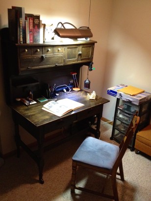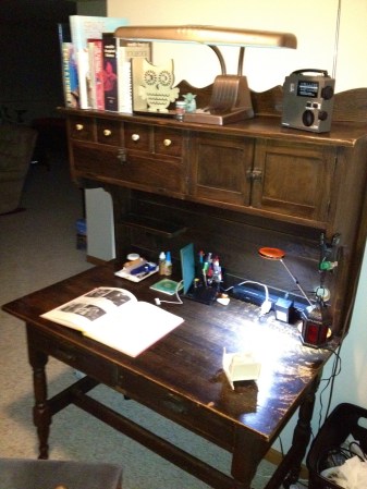 So, I purchased a workstation of sorts at a local coffee shop / gift shop that I instantly fell in love with. It looks like one piece, but it’s actually at least two pieces of furniture cobbled together. The bracing on the bottom is in place backwards and there’s a nameplate for a boiler brand on the front that looks old timey, but isn’t in any way connected with the table / workstation.